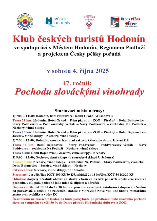 Klub českých turistů Hodonín ve spolupráci s městem Hodonín, Regionem Podluží a projektem Česky pěšky pořádá 4. října 2025 47. ročník Pochodu slováckými vinohrady.