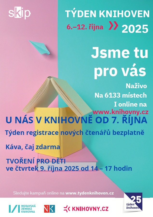 Zveme vás na týden knihoven, který právě probíhá v místní knihovně. Registrace nových čtenářů probíhá bezplatně a zdarma si můžete dát kávu nebo čaj. Ve čtvrtek 9. 10. vás zveme od 14:00 - 17:00 hodin na tvoření pro děti.