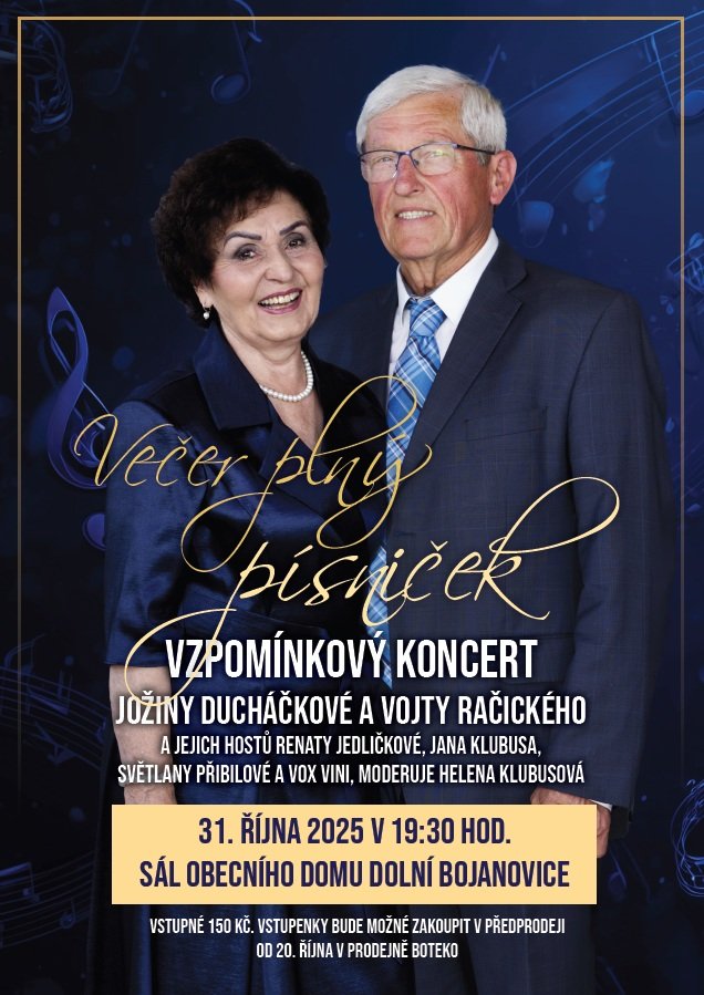 Zveme vás na vzpomínkový koncert Jožiny Ducháčkové a Vojty Račického Večer plný písniček, který se uskuteční v pátek 31. října 2025. Vstupné za 150 Kč je možné zakoupit v prodejně BOTEKO.