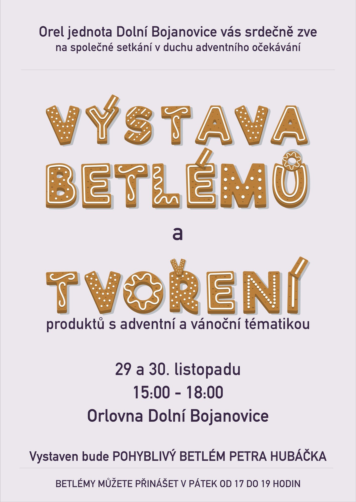 Orel jednota Dolní Bojanovice zve na Výstavu betlémů a adventní tvoření na Orlovně. Akce proběhne o víkendu 29. a 30. listopadu od 15 do 18 hodin.