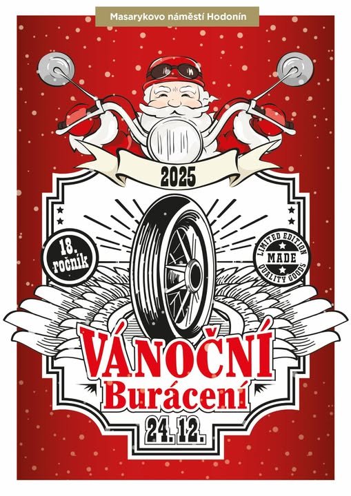 Ve středu 24 .prosince se uskuteční již XVIII. Vánoční burácení. Sraz motorek je na Masarykově náměstí v Hodoníně v11:00 hod. Odjezd je pak ve 12:00 hod. Jede se za každého počasí. Akce má benefiční charakter a přijít se podívat může každý. Výtěžek z letošní sbírky půjde na podporu Barunky Červenkové pro zaplacení více času osobní asistence.