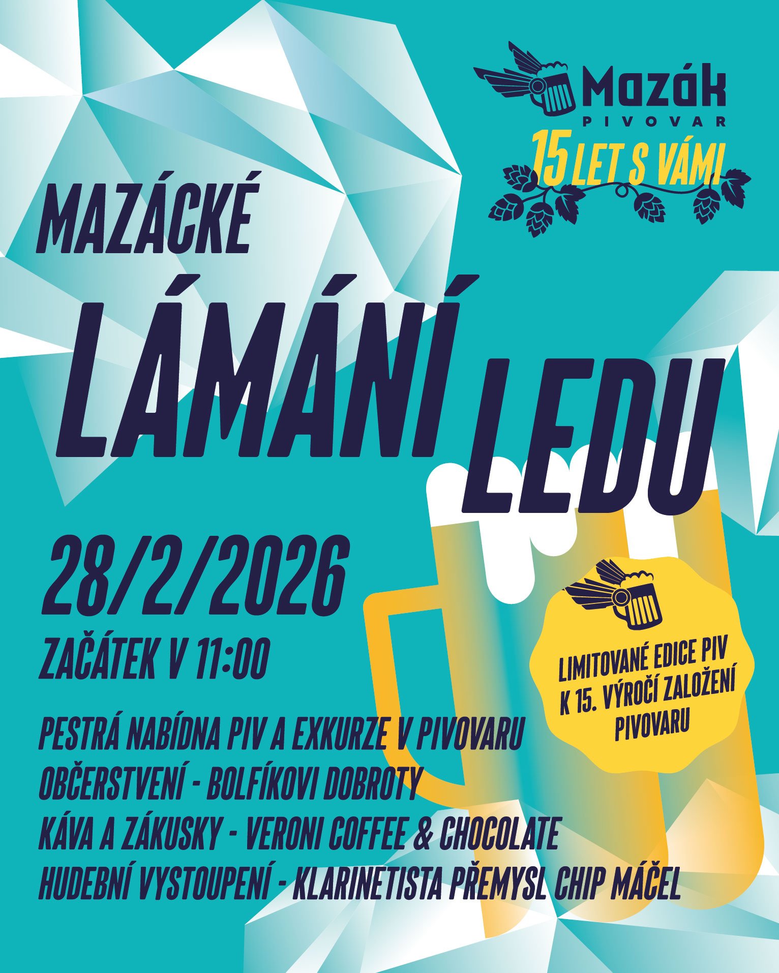 Pivovar Mazák vás zve na Mazácké lámání ledu. Akce se bude konat v sobotu 28.2.2026 od 11,00 hod v areálu pivovaru. Srdečně Vás zveme na den plný dobré nálady, zábavy a dobrého piva! A na co se můžete těšit?