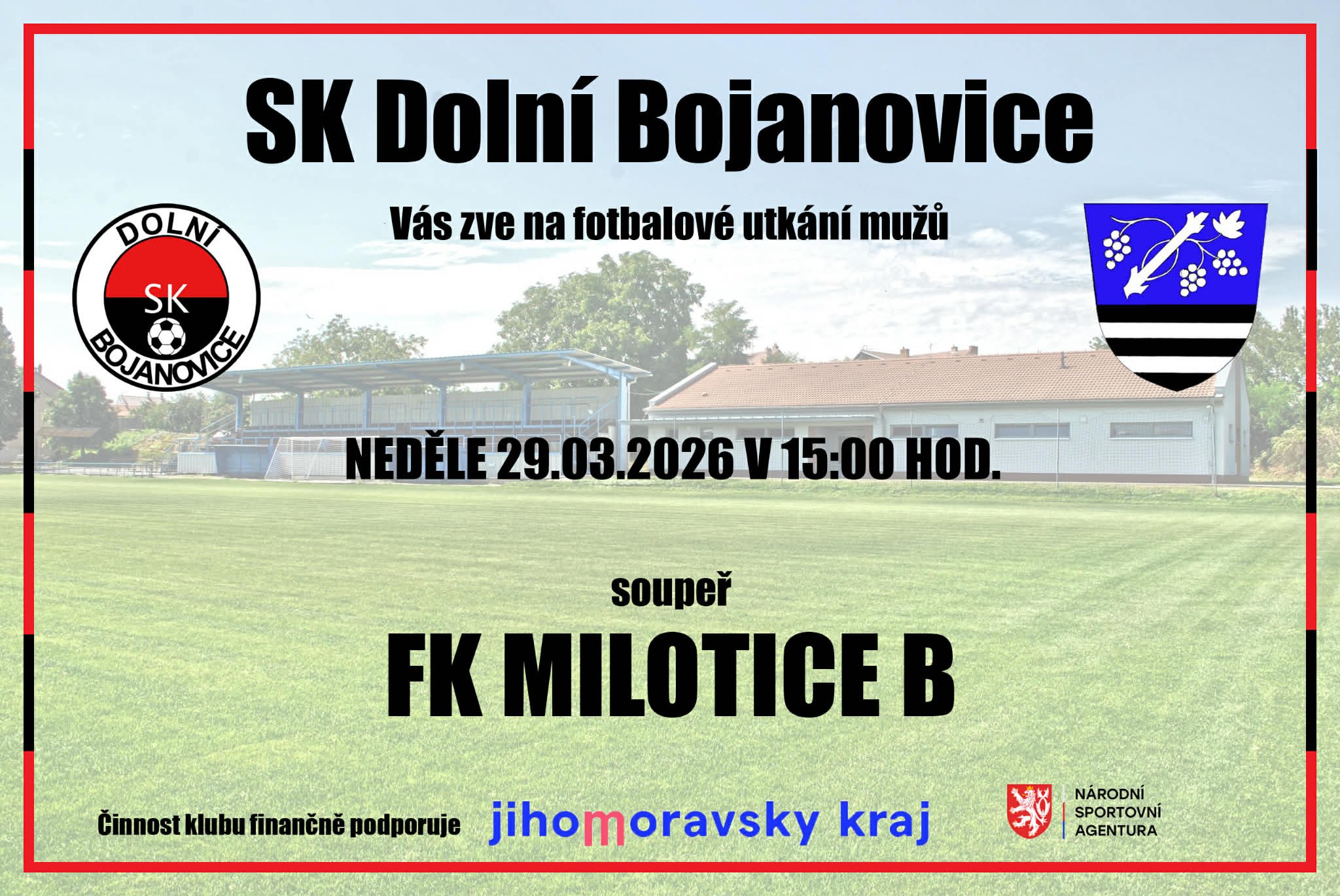 Fotbalový klub SK Dolní Bojanovice vás zve na první jarní mistrovské utkání jarní části sezóny. V neděli od 15:00 hod. vyzveme na domácím hřišti FK Milotice B. Občerstvení zajištěno.