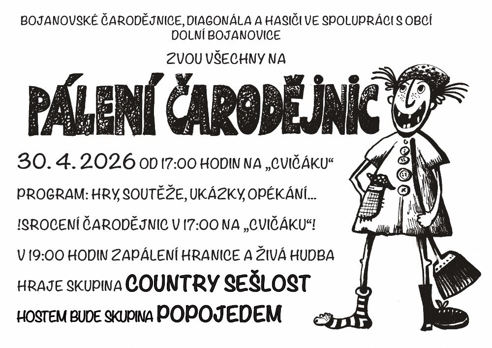 Bojanovské čarodějnice, Diagonála a hasiči ve spolupráci s obcí Dolní Bojanovice zvou všechny občany na tradiční pálení čarodějnic, které se uskuteční ve čtvrtek 30. dubna od 17 hodin na „cvičáku“.