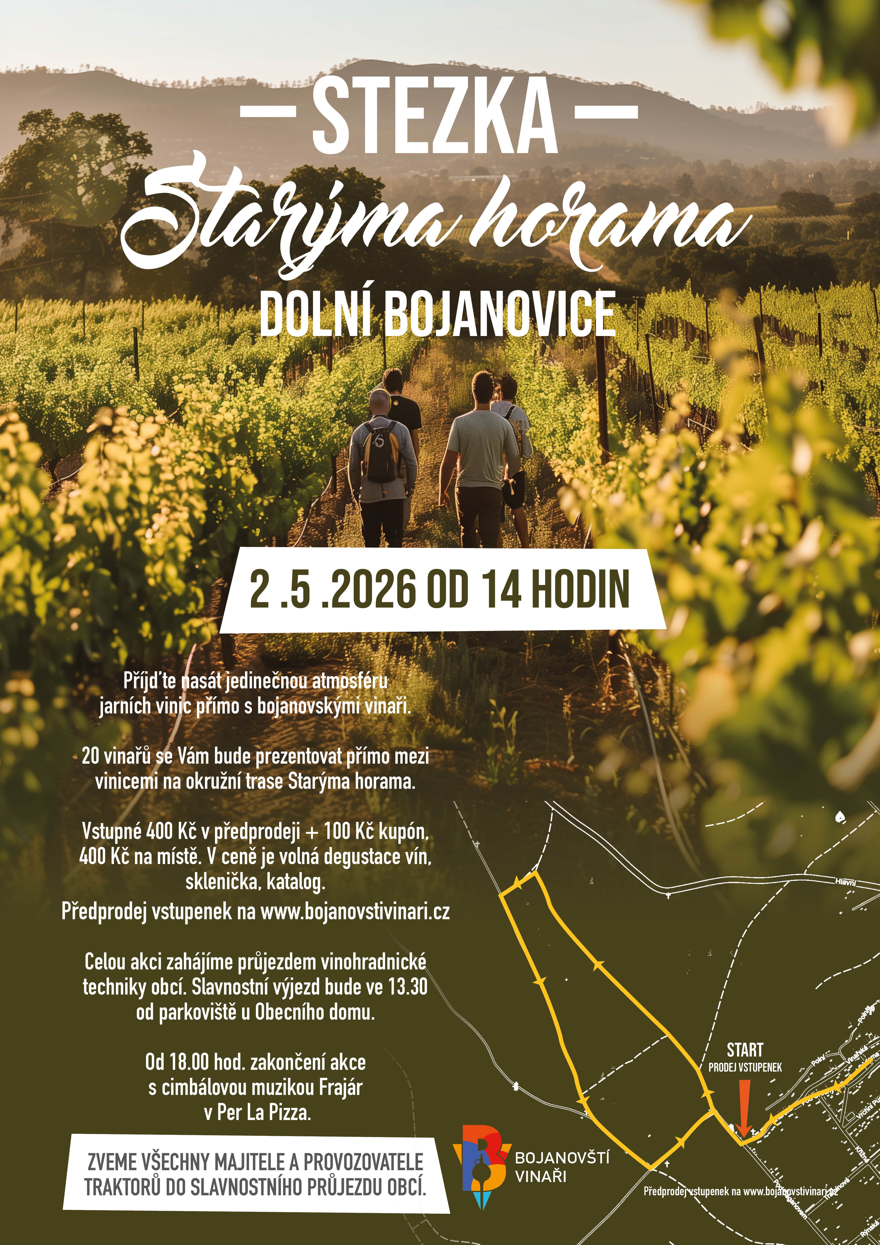 Bojanovští vinaři vás srdečně zvou na Stezku Starýma horama, která se bude konat tuto sobotu ve 14:00 přímo ve viniční trati Stará hora a následné zakončení s cimbálovou muzikou Frajár od 18:00 na parkovišti na ulici Pod Búdama.