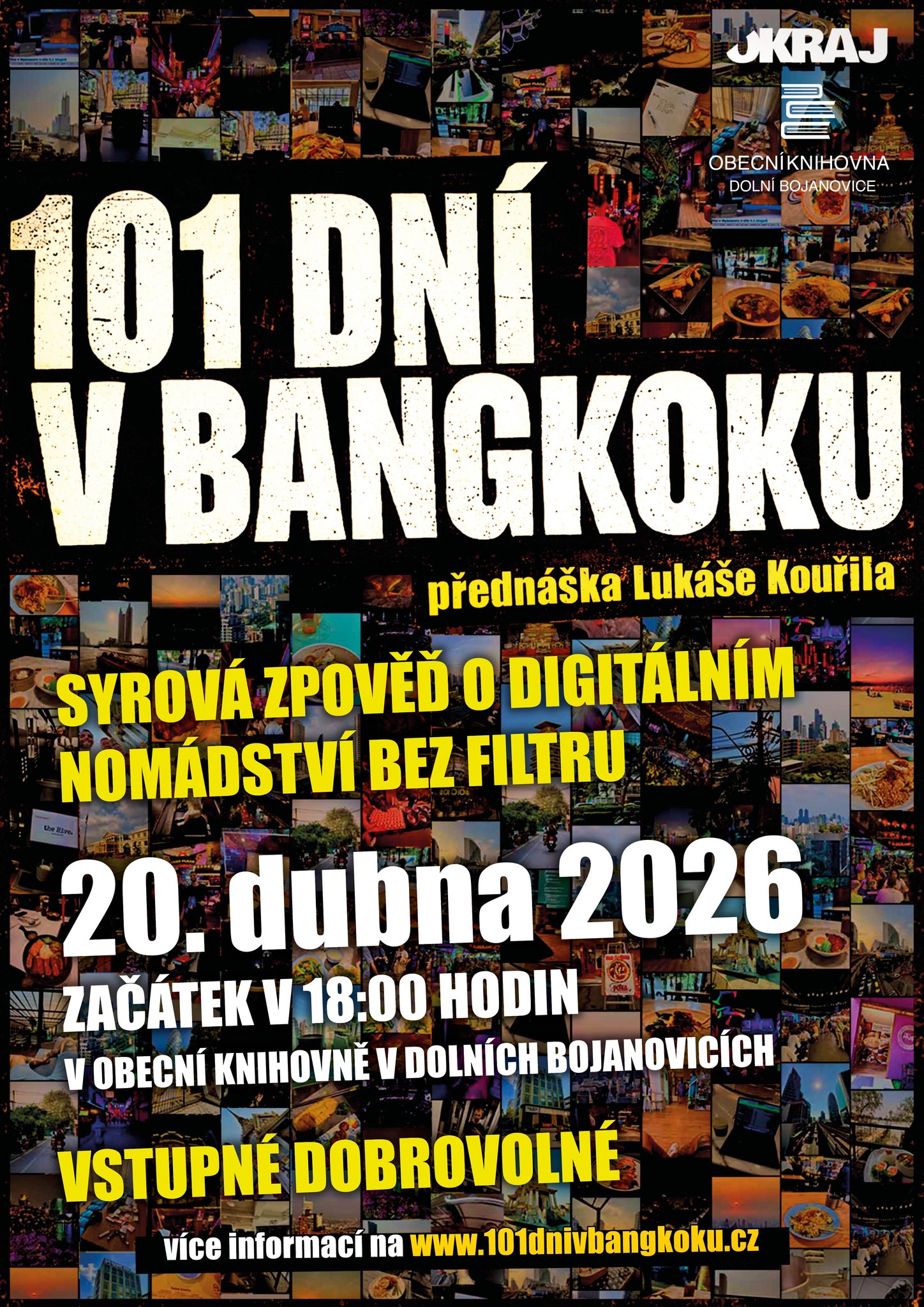 Obecní knihovna v Dolních Bojanovicích zve všechny občany na zajímavou přednášku cestovatele Lukáše Kouřila s názvem 101 dní v Bangkoku. Přednáška se uskuteční v pondělí 20. dubna 2026 od 18 hodin v obecní knihovně. Vstupné je dobrovolné. Více informací naleznete na webu www.101dnivbangkoku.cz.